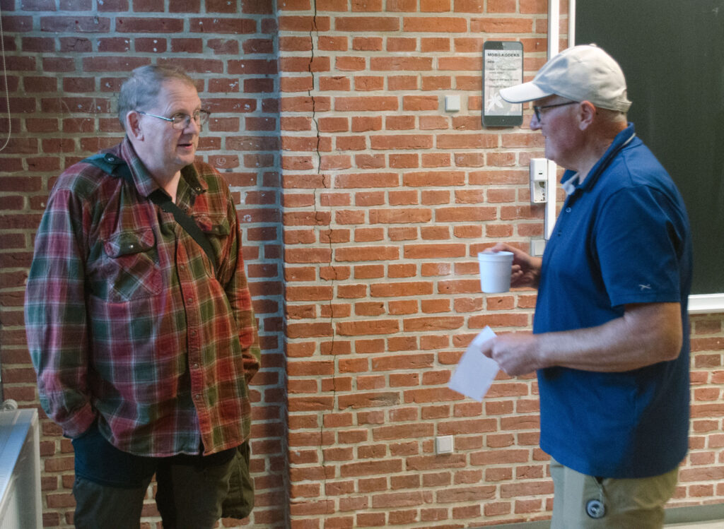 Vores forhenværende formand Jens Lund Jensen mødte også op for at spille med og får sig her en snak med et af de kommende medlemmer, en mand, der vist ikke er helt uden erfaring…